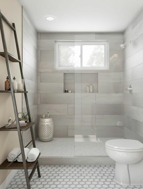 If you're looking at a complete ensuite revamp, why not consider a shower room? Shower rooms are a fantastic way to save space in compact bathrooms. Adding a large shower enclosure will make your space appear bigger and provide more room to dance around in the shower! Alternatively, you can include a modern ladder shelf to sharpen up your bathroom look.